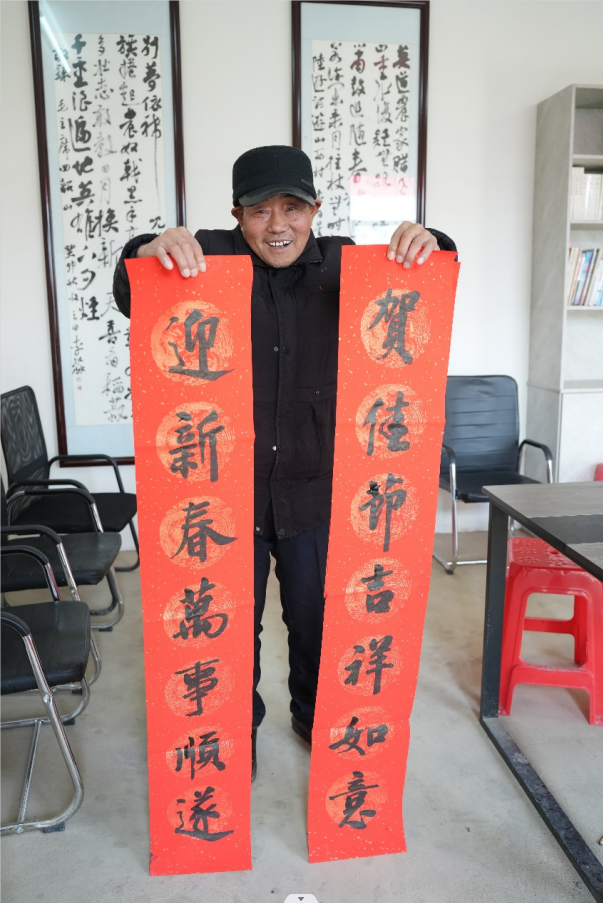 在星燎村老年人日间照料中心,米兰电竞·(中国区)校高层次人才工作办公室七级职员刘宝林,校书画协会会员代悦儿、彭可,通过“书法下乡”为星燎村村民“送福字送春联迎新年”。