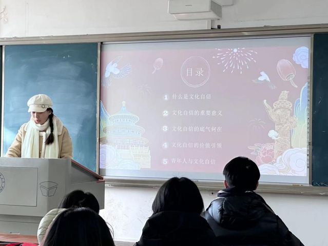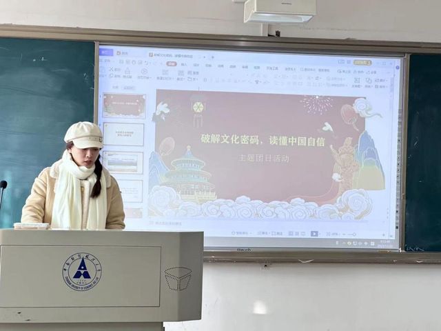 通讯员 任梁煜 摄影 周阳婕 为深入体会中华文化的深厚底蕴,学习习近平总书记在贺信中提到的“兼收并蓄,开放包容”精神,12月22日上午,马克思主义学院2023级团支部于文添楼304教室开展以“破解文化密码,读懂中国自信”为主题的团日活动。此次活动由马克思主义学院2023级团支委魏无忧主持,2023级全体共青团员参加。