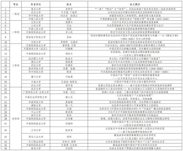 第二十二届湖北省中共党史党建学科及相关学科年会评审委员会坚持公平、公正、匿名评审的原则,经过严格评审,共计有36篇论文获奖。其中一等奖4篇,二等奖6篇,三等奖11篇,优秀奖15篇,具体名单附后。