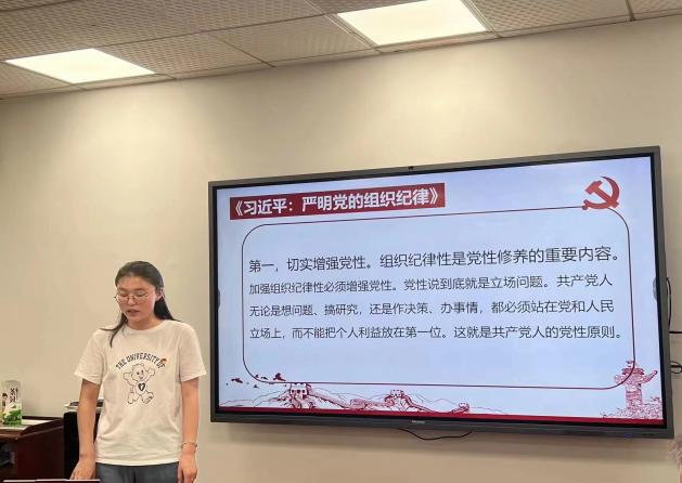 活动开始,首先由韩晓婷同志带领全体党员重温入党誓词。随后大家重点学习了《习近平:严明党的组织纪律》、《中国共产党纪律处分条例(节选)》、《习近平寄语新时代青年强调奋力书写为中国式现代化挺膺担当的青春篇章》等文件精神。