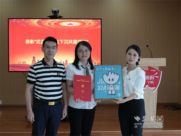 活动现场对在社区建设中作出突出贡献的单位和个人进行了表彰,武汉住房公积金管理中心荣获“武昌区十佳下沉共建项目”称号,张剑同志荣获“武昌区十佳下沉党员”荣誉。此外,社区还为武汉住房公积金管理中心送上了手工制作的武汉住房公积金管理中心政务IP形象“江小金”的创意画作为心意礼物。水域天际社区工作人员表示:“希望未来我们也能像“江小金”头顶这只宽阔的手掌一样继续携手未来,传递温暖。”