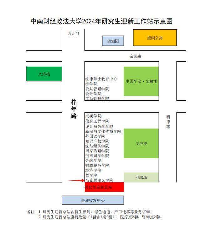 马克思主义学院迎新点设置在梓年路,靠近环湖学生公寓和快递收发中心(菜鸟驿站等),紧邻学校研究生迎新总站,具体位置如下图所示