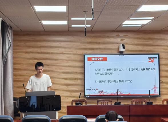 活动第二项:领学文件精神。由彭俞铭同志和付雄同志分别领学《习近平:重整行装再出发,以永远在路上的执着把全面从严治党引向深入》和《中国共产党纪律处分条例(节选)》等相关文件。