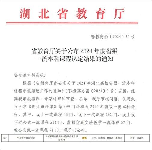 (通讯员 何萍)近日,湖北省教育厅正式公布了2024年度省级一流本科课程的认定结果,学院副院长刘强和《习近平新时代中国特色社会主义思想概论》教研室主任何萍共同主持申报的《习近平新时代中国特色社会主义思想概论》课程,成功入选“湖北高校一流本科课程(线下一流课程)”。