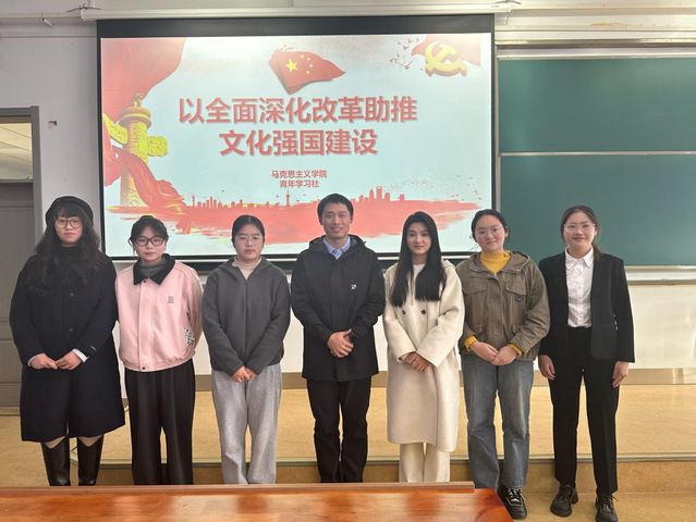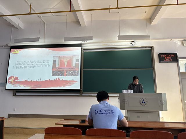 通讯员 梅傲雪 摄影 梅傲雪 为进一步深化对党的二十届三中全会精神的学习,进一步将学生干部的思想与行动统一到全会决策部署上来,11月28日马克思主义学院青年学习社在南湖校区南附楼为我校外国语学院第三期青马班进行理论宣讲。此次宣讲活动的主题是“以全面深化改革助推文化强国建设”。我院青年学习社骨干阮珂主讲。