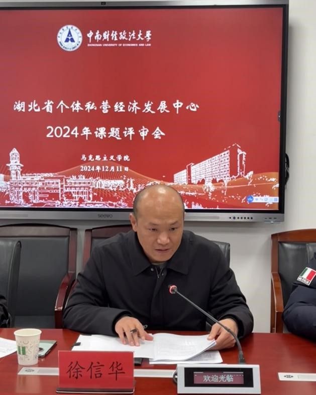 (通讯员 晏方 摄影 晏方)12月11日下午,湖北省个体私营经济发展中心2024年课题评审会在文沛楼402举行,评审会由省个私中心主任许凌主持,省市场监管局注册处陈勇处长、邓从锐处长、佘振义处长,党员生活杂志社王道勇主任,湖北省社科院马克思主义研究所罗志刚所长,湖北大学马克思主义学院徐信华教授,我院付佳迪副院长、龚先庆教授等专家学者共同参加。