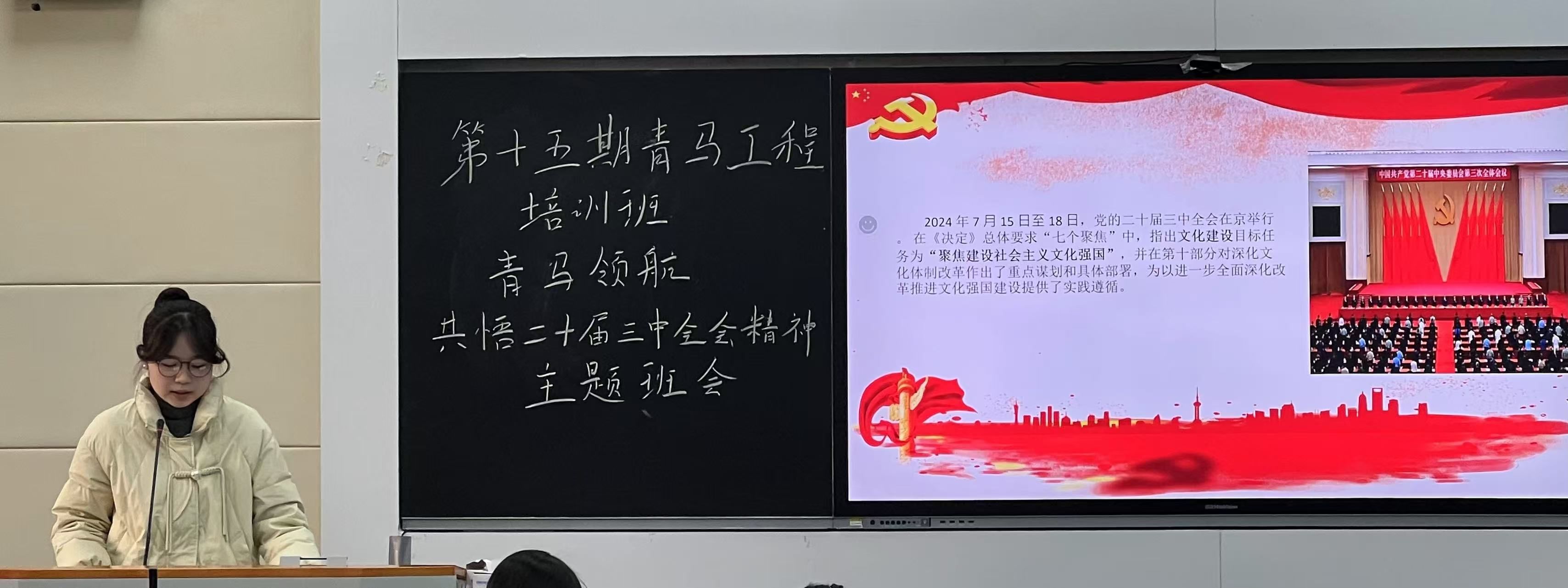 通讯员 张宇捷 摄影 张宇捷 为贯彻落实党的二十届三中全会精神,促进青年团员深刻领悟党的二十届三中全会精神要义,12月15日,马克思主义学院青年学习社为我校统计与数学学院第十五期青马班进行理论授课。此次团课主题是“以全面深化改革助推文化强国建设”。我院青年学习社骨干李谷燚主讲。