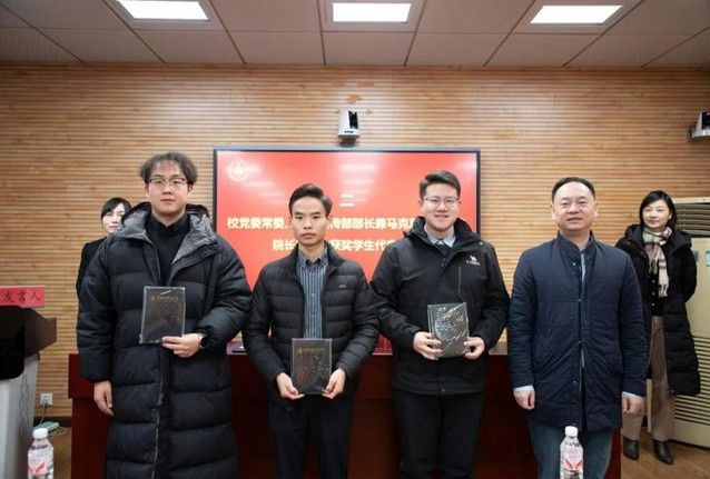 校党委常委、党委宣传部部长兼马克思主义学院院长周巍为盛辰文、李斌、付涵三位获奖学生代表颁发纪念奖品。