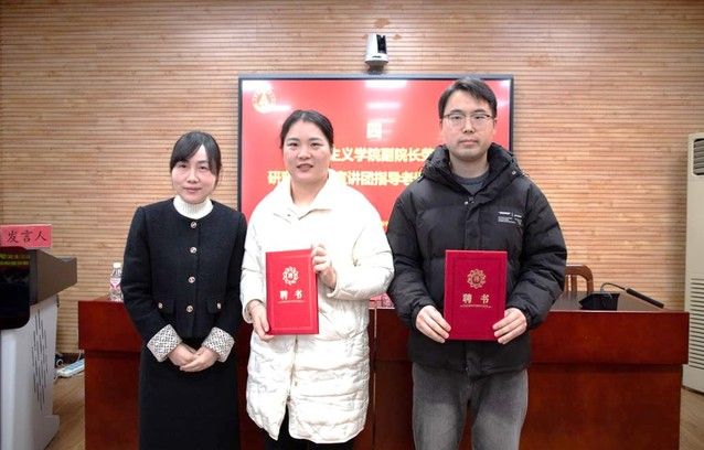 副院长荣枢为研究生理论宣讲团指导老师胡世文、邹胜男颁发聘书。