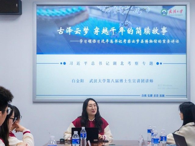 武汉大学博士生宣讲团讲师白金阳近日以《古泽云梦穿越千年的简牍故事——学习领悟习近平总书记考察云梦县博物馆的重要讲话》为题,展开了一场生动的文化宣讲。白金阳以黑夫家书、秦律十八种等珍贵简牍为切入点,带领同学们穿越时空,感受千年前的书信所传达的深厚情感与现代书信的情感共鸣。她强调,这些珍贵的文化资源不仅承载着厚重的历史记忆,更是中华民族智慧的结晶,我们“要善加保护,做好研究”,让其在新时代焕发新的光彩。