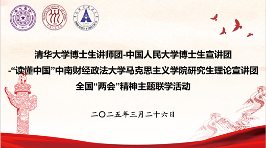 (通讯员 杨茹媛 陈思)2025年3月26日,马克思主义学院研究生第二党支部组织开展了“凝心铸魂强党性 实干笃行启新程”主题党日活动暨2025年全国两会精神学习联合宣讲活动,为更好发挥朋辈榜样引领示范作用,促进兄弟高校间的交流合作,本次活动特别邀请清华大学博士生讲师团和中国人民大学马克思主义学院博士生宣讲团共同参与,围绕全国两会精神展开宣讲,以青年视角解读两会精神,共话当代青年学子的时代使命。