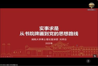 湖南大学博士理论宣讲团团长刘邦志进行了题为《实事求是:从书院牌匾到党的思想路线》的示范宣讲。他从岳麓书院里一副“实事求是”牌匾的故事出发,讲述了“实事求是”从一种方法,一个牌匾,逐渐转变成一条路线,一种思想和一种政治文化的过程,强调了传承这一精神的重要性。最后,他以岳麓书院一副著名对联结束,号召大家不负青春,不负韶华,共同书写时代新篇章。