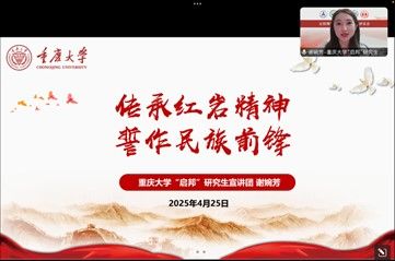 重庆大学“启邦”研究生宣讲团团长谢婉芳进行了题为《传承红岩精神,誓作民族前锋》的示范宣讲。她从一封家书讲起,阐明了红岩精神的时代价值和传承这一精神的具体路径,使大家深刻感悟到红岩精神的魅力。最后,她借用江姐在家书中对儿子的殷切嘱托与大家共勉,呼吁大家为实现中华民族伟大复兴而不懈奋斗。