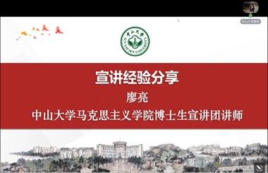 中山大学马克思主义学院博士生宣讲团讲师廖亮结合自身的宣讲经历,分享理论宣讲经验。他指出,宣讲的任务是要用通俗易懂的语言将党的创新理论以人民大众听得懂的语言讲出来。其次,理论宣讲选题有一大一小两个方面,大的方面是指范围较广的政治前沿热点,小的方面是指从小切口来讲大选题,以小见大。接着,他从理论和逻辑方面分享了备课经验,以及语言表达和材料选取等方面需要注意的问题。最后以“用心”一词进行总结,即用心去研究,用心去观察,用心去思考,用心去推敲,用心去准备。