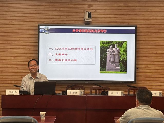 (摄影 刘云 通讯员 刘云)为深入推进思政课程改革创新,提升国家级一流本科课程建设水平,6月5日下午,我院中共党史党建党支部在文沛楼409会议室成功举办“强国行”思政课程建设研讨会。本次研讨会特邀江汉大学原马克思主义学院院长李腊生教授作专题报告,由中共党史党建党支部书记项晨光主持,支部全体党员及各教研部主任参加。
