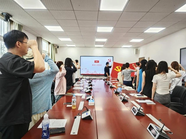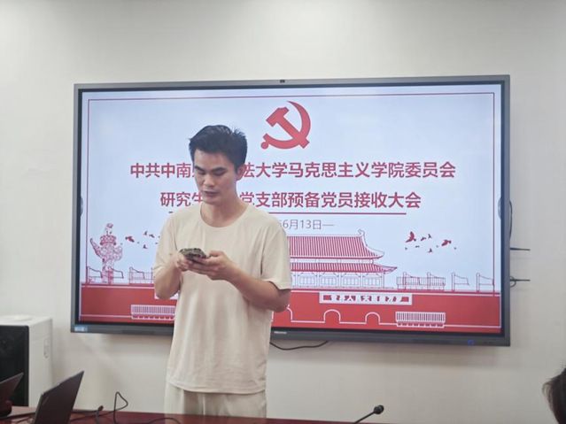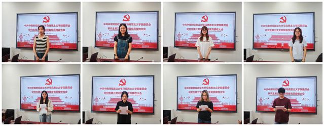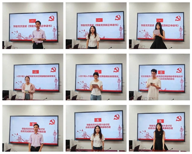 组织委员兼纪检委员付雄同志代表支部委员会报告对相关发展对象的审查情况,并建议大会接收八名发展对象为中共预备党员。全体正式党员对八名发展对象能否入党逐一充分讨论并进行无记名投票表决。根据表决,大会一致同意接收欧阳涛、任梁煜、魏无忧、代雯珂、马佳宁、颜娜、胡阳琳、曾怿晨八名同志为中共预备党员,并由其入党介绍人为其颁发党徽、党章与党员手册。