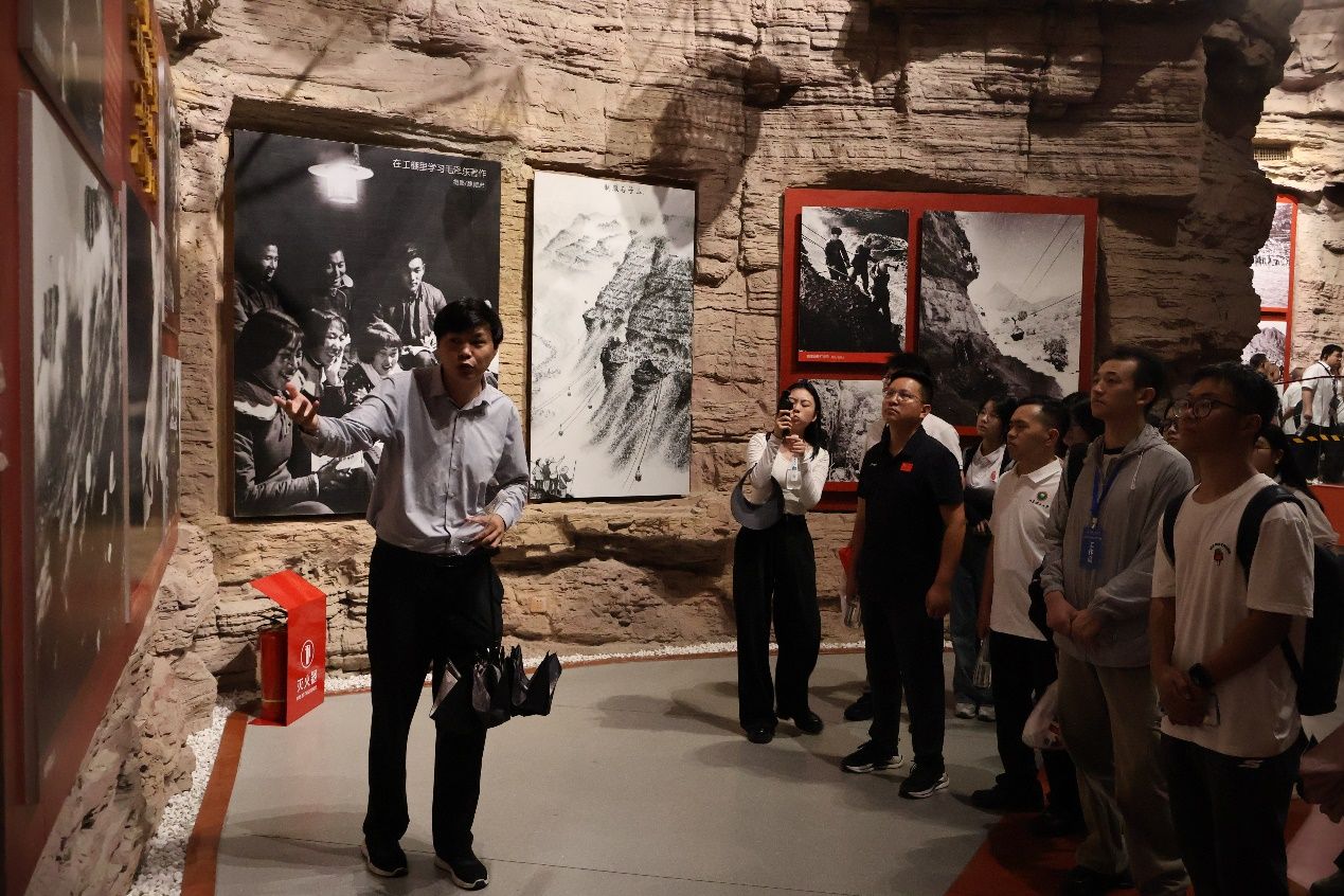 7月4日上午,研学之旅在红旗渠的壮阔史诗中展开。五校宣讲团成员首先步入红旗渠纪念馆,在郑州大学博士生宣讲团成员翔实而饱含深情的讲解中,一幅幅图片、一件件实物、一段段影像,生动再现了林县人民在极其艰难的条件下,凭借“自力更生、艰苦创业、团结协作、无私奉献”的精神,十年奋战、削平山头、架设渡槽、开凿隧洞,最终引来漳河水的惊天伟业。青年学子们凝视着历史的痕迹,内心深受震撼。