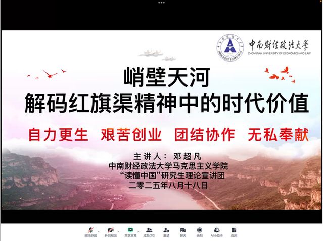 在第三期的活动中,邓超凡以《峭壁天河:解码红旗渠精神中的时代价值》为主题,他结合红旗渠工程的修建过程,介绍了当年林县人民的英雄气概。通过具体分析“自力更生、艰苦创业、团结协作、无私奉献”的红旗渠精神的内涵,引申到其与生俱来地体现着中国共产党人“全心全意为人民”的初心使命,体现着社会主义“集中力量办大事”的制度优势。最后,他号召大家传承和发扬红旗渠精神,以自力更生的勇气、艰苦创业的毅力、团结协作的力量和无私奉献的情怀,投身到科研攻关、乡村振兴和国家建设中。