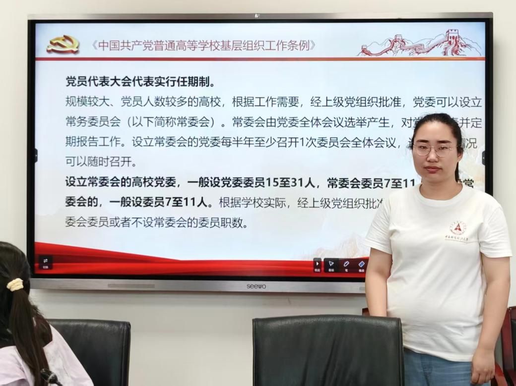 吕昕馨同志带领深入学习了《中国共产党基层组织选举工作条例》《中国共产党普通高等学校基层组织工作条例》及换届纪律等相关要求,进一步明确基层党组织换届选举的流程规范,支部党员深刻认识换届选举工作的重要性和严肃性。