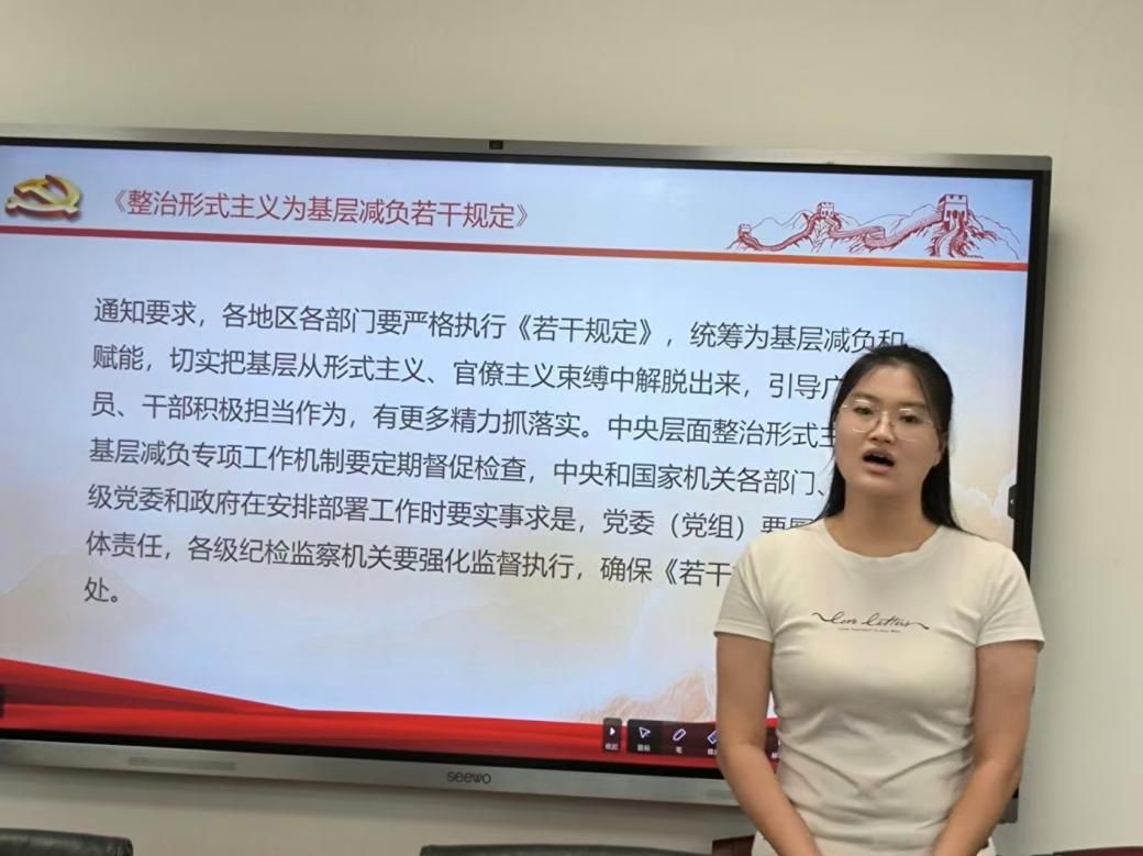 朱子琳同志领学文件《整治形式主义为基层减负若干规定》。她以《反对本本主义》为切入点,介绍了《若干规定》出台的背景和意义。《若干规定》既是对百年党史中反对形式主义优良传统的继承发展,也是新时代推进全面从严治党向纵深发展的制度创新。