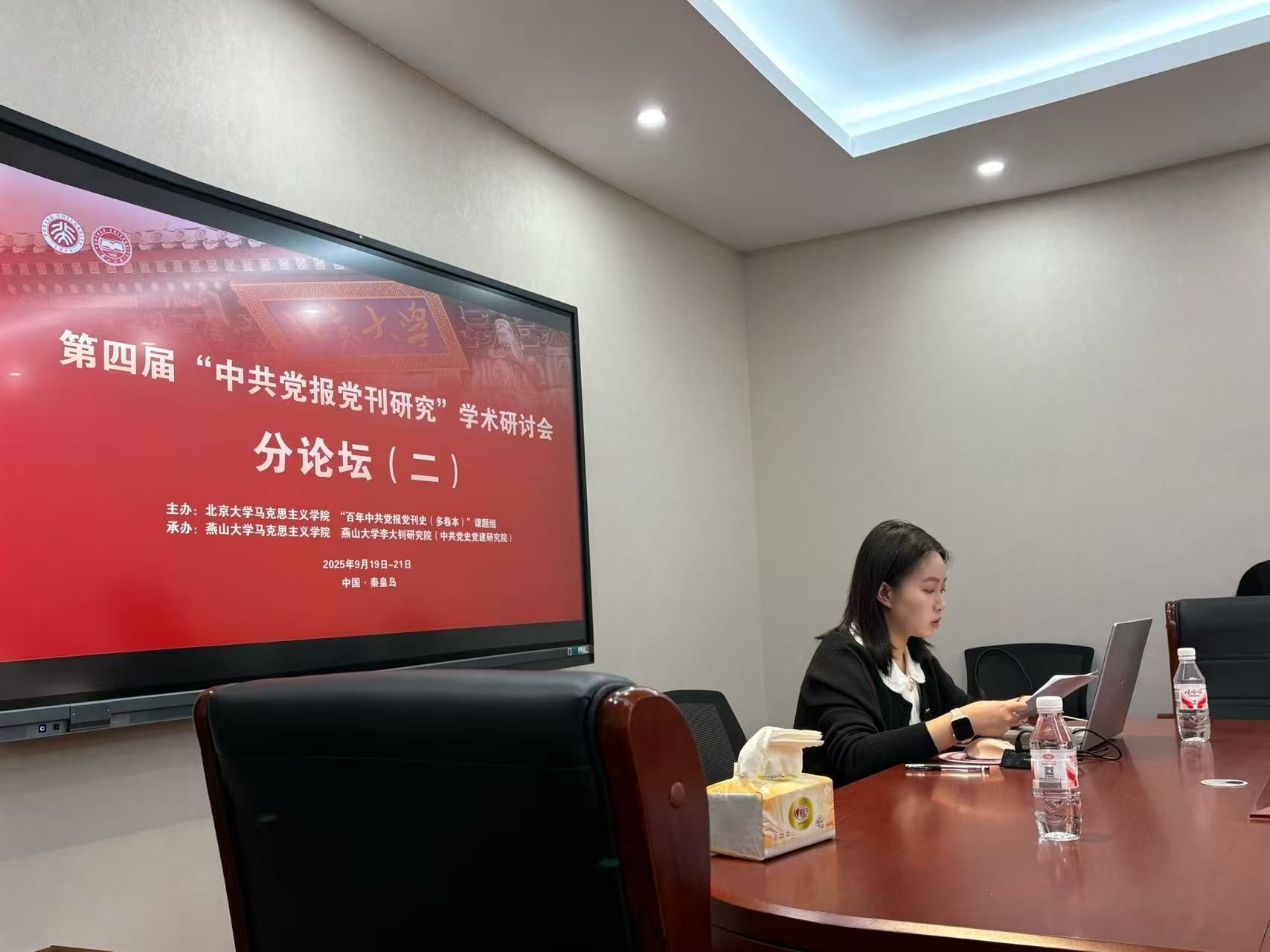 (通讯员 任梁煜)2025年9月20日,由北京大学马克思主义学院和国家社会科学基金重大项目“百年中共党报党刊史(多卷本)”课题组主办、燕山大学马克思主义学院和燕山大学李大钊研究院(中共党史党建研究院)承办的第四届“中共党报党刊研究”学术研讨会在秦皇岛举行,北京大学、清华大学、中国人民大学、复旦大学、南开大学、天津大学、同济大学、中山大学、中共中央党校(国家行政学院)、中国社会科学院、光明日报社等38家高校党校、科研单位、学术报刊编辑部50余位专家学者以及燕山大学马克思主义学院150余位师生代表参加会议。燕山大学马克思主义学院教授、院长柴勇主持开幕式。我院2023级中共党史专业硕士研究生任梁煜撰写的论文《<人民画报>对青年形象的塑造(1950-1956)》成功入选此次学术研讨会并受邀于会上发言。