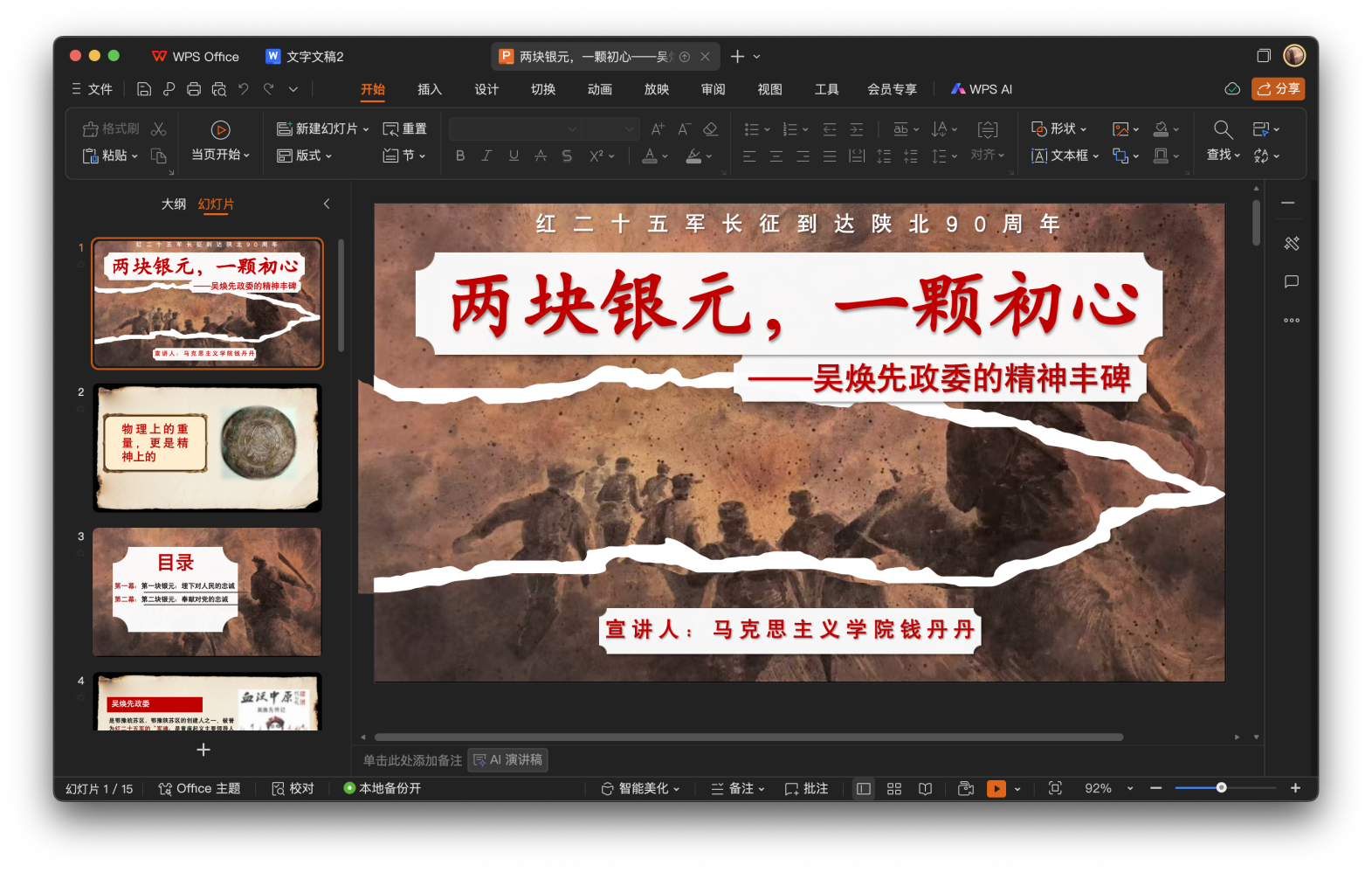 钱丹丹围绕“两块银元,一颗初心”,通过吴焕先政委“红薯地埋银元补偿百姓”“战火中身中七弹仍冲锋”的两个场景,诠释共产党人“为民”“为党”的忠诚担当。