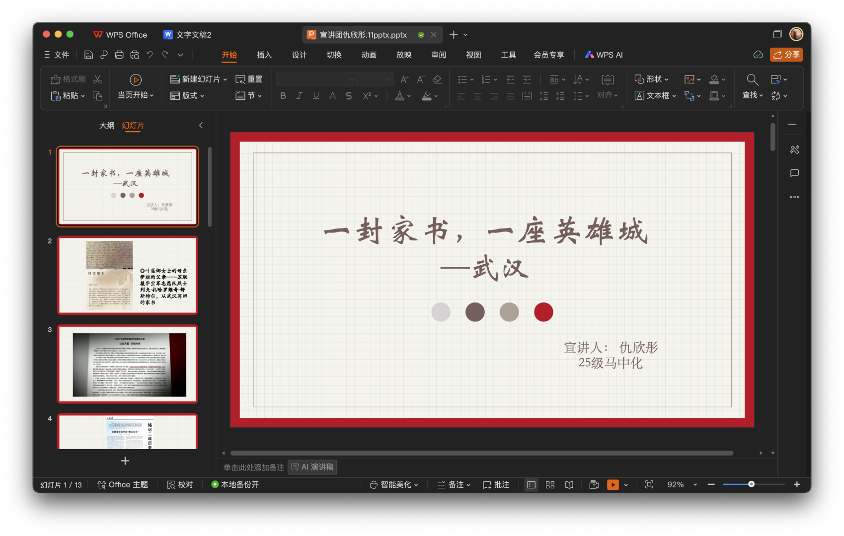 仇欣彤以苏联援华空军烈士舒斯特尔的家书为线索,串联1938年武汉“二一八”“四二九”空战史实与叶莲娜女士捐赠家书的当代故事,用“烽火家书—英雄牺牲—城市重生”的叙事,传递跨越国界的反法西斯情谊。