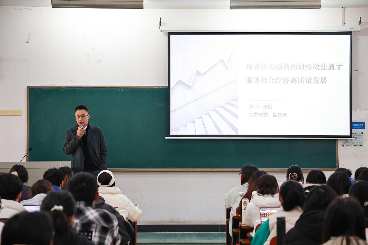 (通讯员 宫晓雪 摄影 崔桢桢)12月3日上午,校党委常委、副校长张琦教授在文波楼209教室,为会计CPAC2401班、法2410班学生讲授题为“培养拔尖创新的财经政法通才”的思政课。张琦围绕“为何需要通才、为何需要财经政法通才、如何培养财经政法通才”三大核心问题展开授课,马克思主义学院教师及相关学院辅导员现场听课。