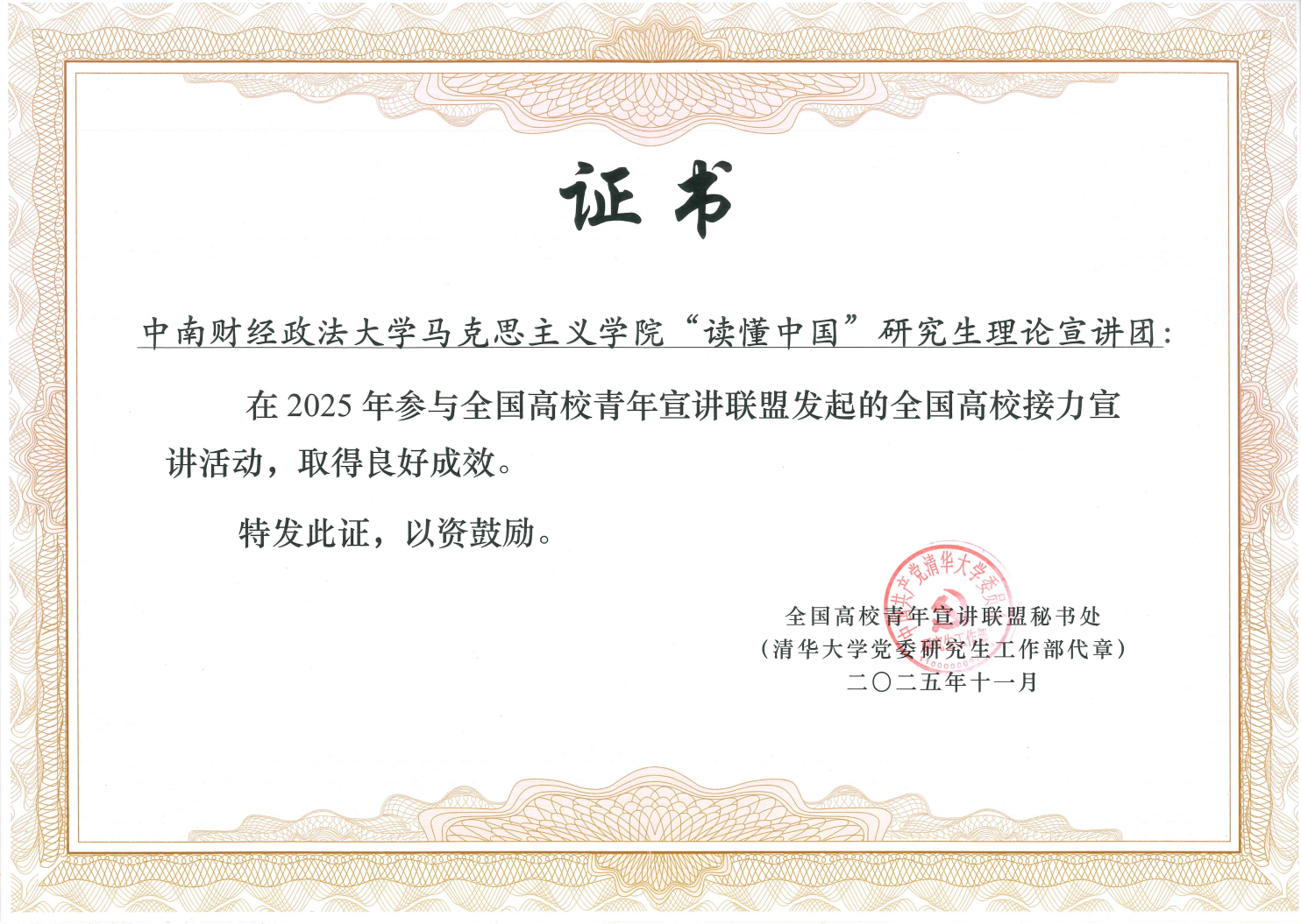 我院“读懂中国”研究生理论宣讲团作为全国高校青年宣讲联盟成员,于今年6月举办读懂中国·理响南湖——全国高校青年接力宣讲暨第十届“立马万言”全国研究生学术论坛分论坛,活动由全国高校青年宣讲联盟发起并指导,米兰电竞·(中国区)马克思主义学院承办,采用“联合宣讲+座谈交流”的形式,来自15所高校理论宣讲团代表,以“新质赋能现代化 青年共话新思想”为主题开展联合宣讲研讨。同时,全国高校青年宣讲联盟于今年9月份发起“八秩回响·青言新声”全国高校接力宣讲活动,联动全国各地区高校接力开展“伟大抗战精神”主题宣讲活动,经过申请,我团成为全国12所承办单位之一。以上事迹充分彰显了我团作为联盟成员的责任与担当,此次受邀领奖也是全国高校青年宣讲联盟对我团工作的高度肯定,是我院研究生培养的重要成果体现。
