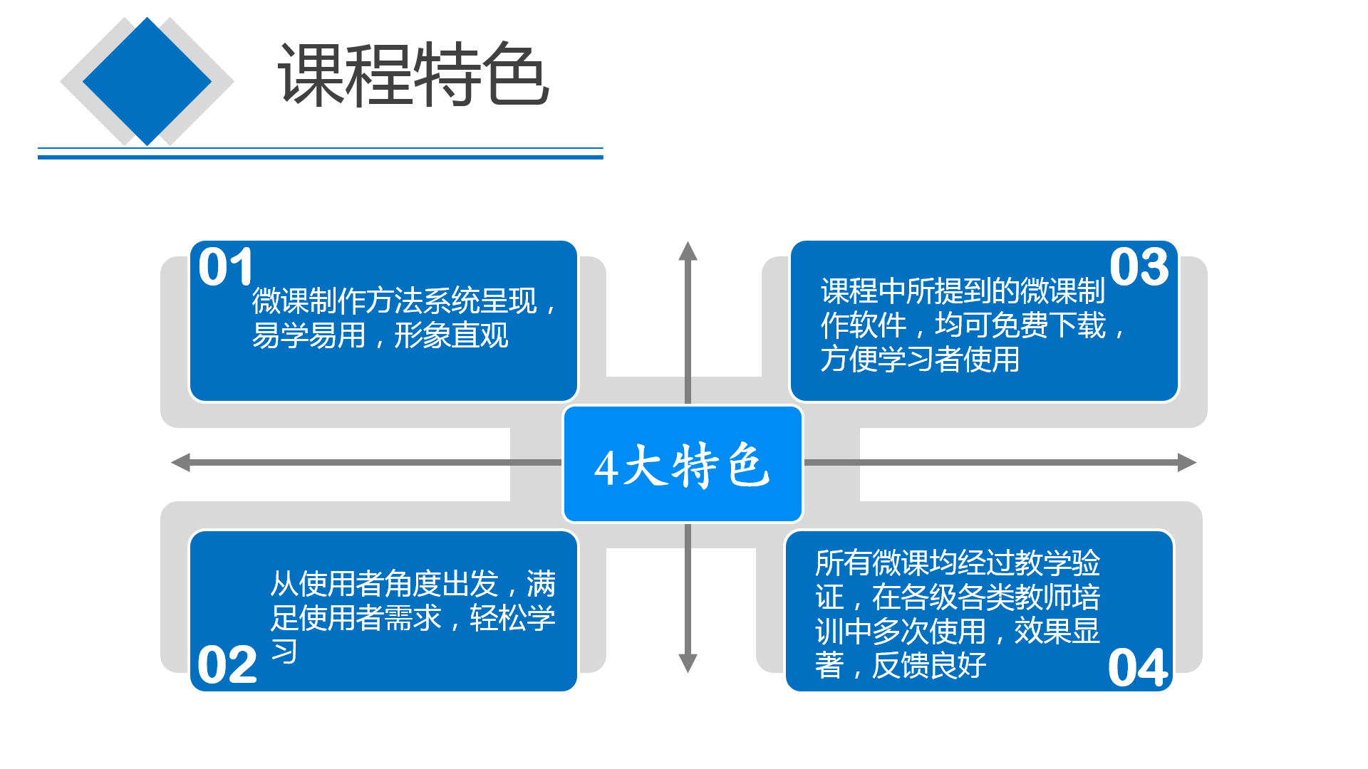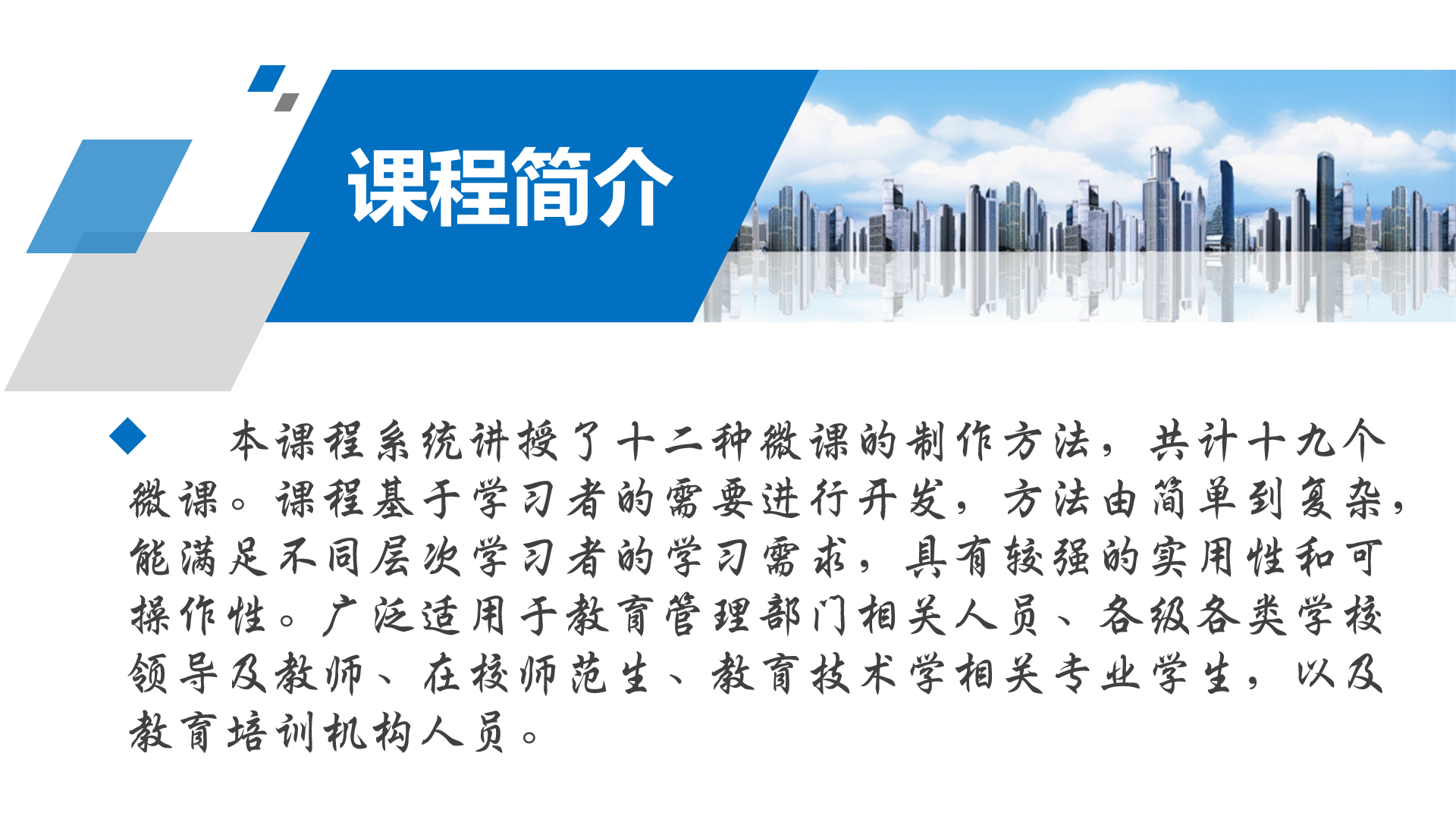 本课程系统讲授了十二种微课的制作方法,共计十九个微课。课程基于学习者的需要进行开发,方法由简单到复杂,能满足不同层次学习者的学习需求,具有较强的实用性和可操作性。广泛适用于教育管理部门相关人员、各级各类学校领导及教师、在校师范生、教育技术学相关专业学生,以及教育培训机构人员。