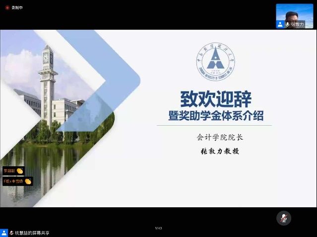 开幕式第一项,张敦力教授致欢迎辞。他对参与本次线上校园开放日的同学表示热烈欢迎。随后他对学校和学院进行了详细的介绍,指出我校是教育部直属、国家“211工程”重点建设高校和“985”优势学科创新平台高校;是世界一流大学和一流学科建设高校。我院是首批“全国党建工作标杆院系”创建单位,拥有国家级重点学科、湖北省优势学科。同时他还向同学们展示了我院强大的科研实力。最后他介绍了学院以“学校常规奖学金、学院(中心)自设特别奖学金、企业捐助专项奖学金”为三大主线的奖学金政策。开幕式第二项,汤湘希教授分别从学科、专业、招生和培养四个方面进行了详细的介绍。他强调我院历史传承积淀深厚、学科状况绝对突出、师资力量实力雄厚、研究生教育声誉卓著、科学研究雄踞一流、人才培养求实创新。开幕式最后一项,郭飞教授宣布“2020会计学院(会硕中心)优秀本科生研招校园开放日正式开幕!”