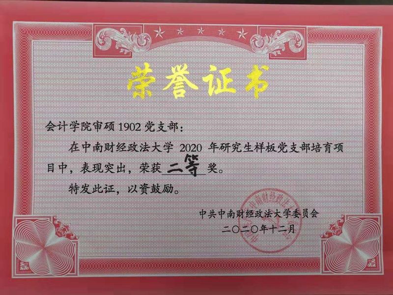 12月11日上午,学校2020年研究生样板党支部培育项目成果展评会在文澴楼同声传译国际会议室举办,活动由党委组织部、党校和党委研究生工作部主办,校研究生会承办,校党委常委、副校长覃红教授、党委研究生工作部肖翠祥部长、机关党委周佳玲书记、校团委梁娜书记、党委宣传部徐江副部长和党委组织部陈金川副部长作为评委莅临本次展评会。经激烈角逐,审硕1902党支部荣获大会二等奖。
