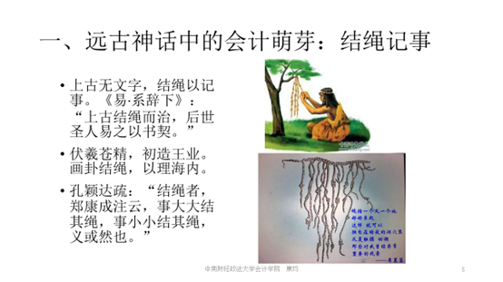 随后,他以中华古代文化中的神话传说与历史故事为切入点,结合相关文物和史实,从远古神话中的会计萌芽——结绳记事开始,依次讲述了春秋战国时期孔子的会计认知、唐代传奇小说中的原始凭证、宋代名人诗词中的会计术语和元曲中的民间会计组织与账簿,从不同侧面介绍了中国古代会计发展的有关知识。