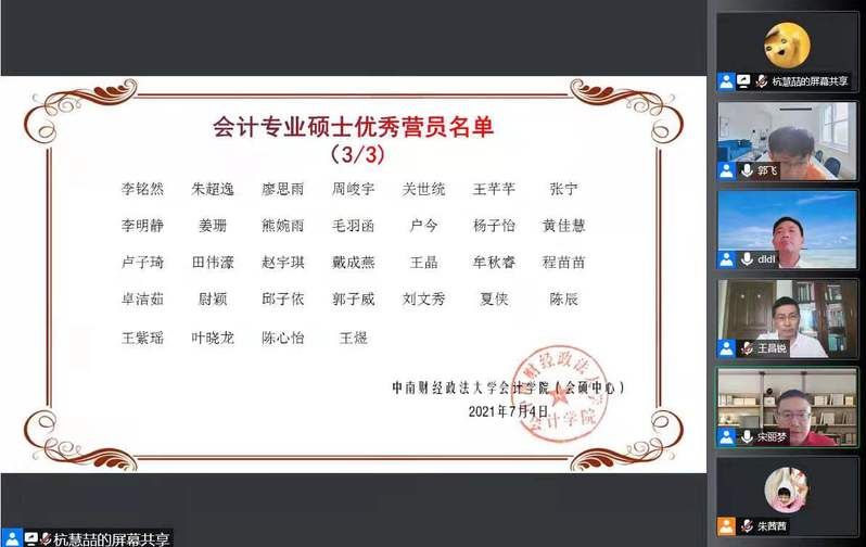 7月4日下午3:00,2021年文澜优秀大学生夏令营“会人会语”分营闭营仪式在线上召开。经过为期2天的综合考察,221名优秀大学生荣获“优秀营员”称号,赢得会计学院(会硕中心)2022年硕士研究生推免生优先录取资格。