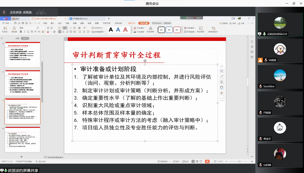 课程的下半段,武丽波女士对审计划阶段、审计实施阶段、审计完成阶段中具体的审计工作要点进行了详细的分析,结合自身实务经验讲述了审计判断在审计全过程中的运用,并耐心地解答了同学们提出的与审计实务相关的困惑,鼓励同学们在未来的审计工作中既要有谦虚的姿态,也要敢于表达,勇于发表自己的见解,并在工作中学会沟通,时刻明确自己的审计目标,这样才能在审计工作中保持独立和清醒的头脑,才能顺利完成审计任务。在场学生多次留言对武丽波女士专业、倾心的见解表达感谢与敬意。