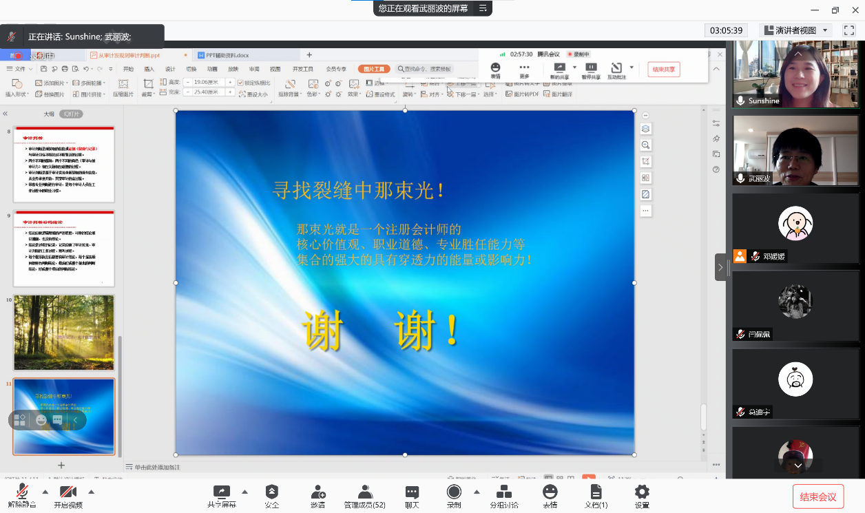 2021年6月4日,信永中和会计师事务所合伙人、中国注册会计师、全国会计高端人才(后备)、深圳注册会计师协会调查委员会委员武丽波女士应我院陈丽红教授邀请,通过“腾讯会议”在“云端”与我院专业硕士面对面,进行了主题为“万物皆有裂缝,那是光照进来的地方——从审计发现到审计判断”的课程讲授,众多师生慕名而来参与学习、互动。武丽波女士结合自身丰富的执业经验,给大家分享了自己对于审计发现的深刻体会,讲述了审计人员应当如何将审计判断贯穿审计全过程。课程内容生动且与实务联系紧密,过程中我院学生积极留言、踊跃提问,表现出强烈的学习热情。