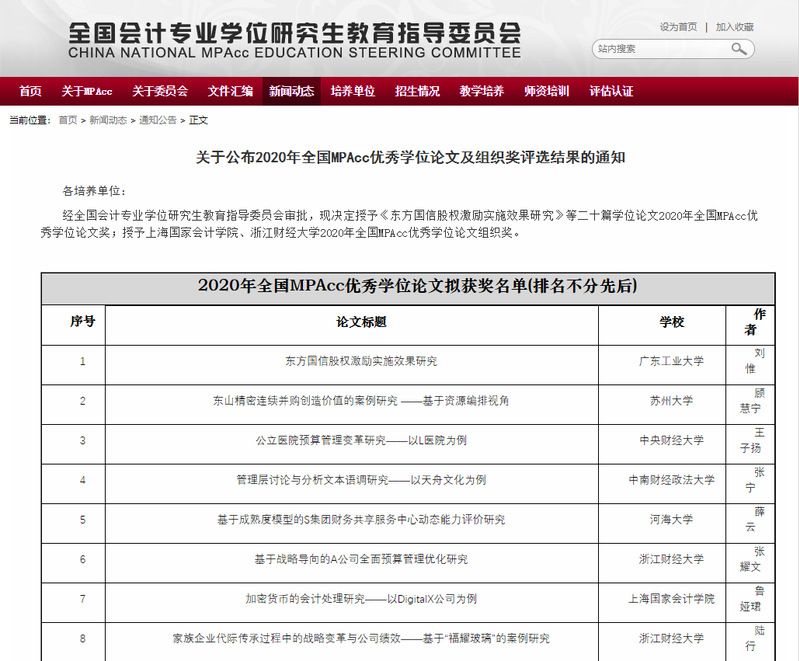 全国MPAcc优秀学位论文由全国会计硕士教指委每年组织评选,2020年度共评选出20篇优秀学位论文。目前全国有267家MPAcc培养单位,每年MPAcc毕业生近20000人。近年来,学院(中心)高度重视专业硕士人才培养改革,积极探索校企协同人才培养模式和新时代“大智移云”背景下专业硕士人才培养改革,通过优质生源选拔、双导师制、案例教学、案例大赛、实习实践、论文质量控制等环节全方位积极提高专业硕士培养质量,先后在中国MPAcc学生案例大赛、全国MPAcc优秀学位论文评选和优秀教学案例评选中斩获佳绩,学院(中心)将积极秉承“博文明理,厚德济世”的校训,全面落实立德树人根本任务,努力在全国MPAcc教育中传播中南大声音,积极为新时代中国特色社会主义建设培养更多高水平地专门财会人才!