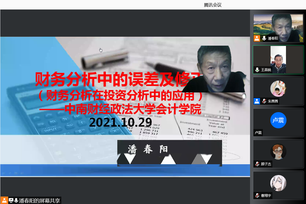 10月29日晚6:30,会计学院(会硕中心)专业硕士研究生合作指导教师潘春阳副教授应邀通过腾讯会议为专业硕士讲授了题为《 财务分析中的误差及纠偏》的专题讲座。此次讲座由会硕中心主任兼学院副院长王昌锐教授主持,专硕导师组组长王嘉鑫副教授、研究生工作办公室主任向传殿老师以及180余位2021级专业硕士研究生参加了此次讲座。