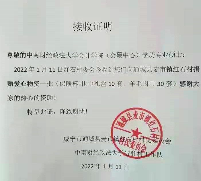 1月11日,一批满载着会计学院研究生深厚情谊、价值3000元的保暖物资,跨越200公里的距离,送到了咸宁市通城县麦市镇红石村村民委员会的手中。2021年12月下旬,为了培养学生的社会责任感,会计学院学历专业硕士开展了“爱心义卖 情暖红石”主题志愿服务活动,通过义卖闲置物品筹集善款,为红石村幼儿及学生购买保温杯和羊毛围巾,在寒冬来临之际,为他们送上一份特殊的新年礼物。