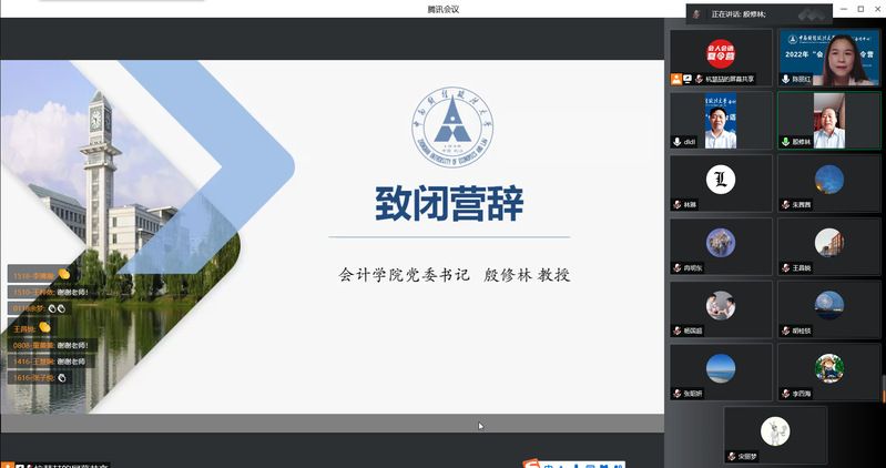 闭营仪式由会计学院副院长陈丽红教授主持,学院院长张敦力教授、党委书记殷修林教授、会硕中心主任兼副院长王昌锐教授、党委副书记徐会超副教授、副院长冉明东教授、副院长李四海教授、党委副书记胡桂锬,以及学硕、专硕导师组长,研究生工作办公室老师及研究生志愿者等参加。