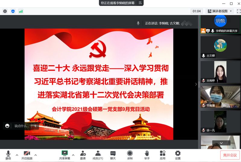 2022年9月18日,会计学院2021级会硕第一党支部在腾讯会议开展主题为“喜迎二十大,永远跟党走——深入学习贯彻习近平总书记考察湖北重要讲话精神,推进落实湖北省第十二次党代会决策部署”的主题党日活动。活动由党支部副书记李炳晓主持。