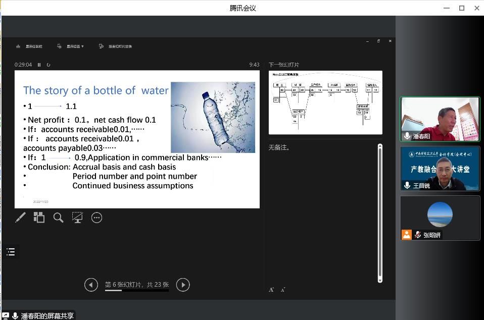 为适应社会对高端财会审人才的需求,培养具有较强专业能力、职业素养和创新思维的应用型会计、审计专业人才,会计学院(会硕中心)产教融合育人大讲堂第一讲于2022年11月23日上午9:00在腾讯会议开讲。会计学院(会硕中心)专业硕士研究生合作导师潘春阳应邀为我院专业硕士研究生带来了题为《现金的奥秘》的专题讲座。本次讲座由会硕中心主任兼副院长王昌锐教授主持。研究生工作办公室主任张昭妍老师、200余名专业硕士研究生参加了此次讲座。