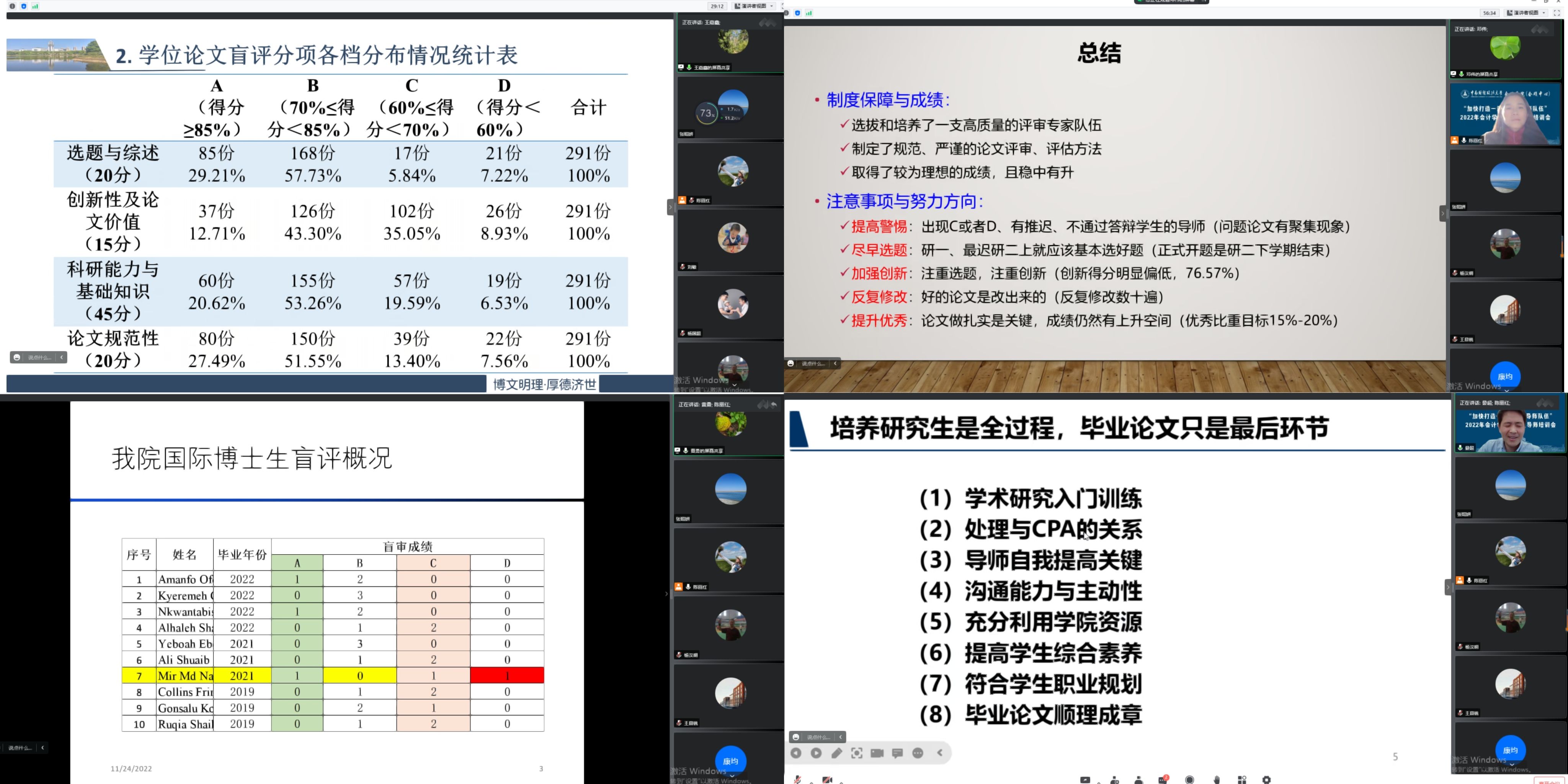会议第二部分为研究生导师论文指导交流会。专硕导师组组长王嘉鑫副教授、学硕导师组组长邓伟副教授从论文的选题与综述、创新性及论文价值、科研能力与基础知识以及论文规范性等方面分别对学院2022年专硕和学硕研究生论文盲评情况进行了详细报告,并提出今后的改进建议和努力方向。留学生导师组组长黄勇副教授对我院留学生论文盲评情况进行了汇报,建议留学生撰写论文尽量选择中国背景的题目。晏超副教授从学术研究入门训练、处理与CPA的关系、导师自我提高,符合学生职业规划等方面为大家分享了关于学术型硕士研究生培养的经验。