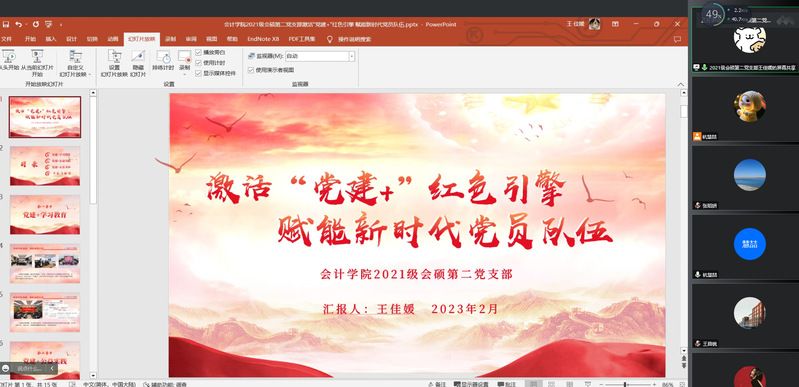 2月24日,会计学院2021级会硕第二党支部、2022级会硕第一党支部在前期已分别开展组织生活会的背景下,通过腾讯会议平台联合召开深化组织生活会,旨在进一步开展批评和自我批评,加强两个年级支部间的交流,取长补短、互相学习、共同进步。联系两个支部的党委委员、会计学院会硕中心主任兼副院长王昌锐教授到会指导,会议由研究生辅导员杭慧喆主持。