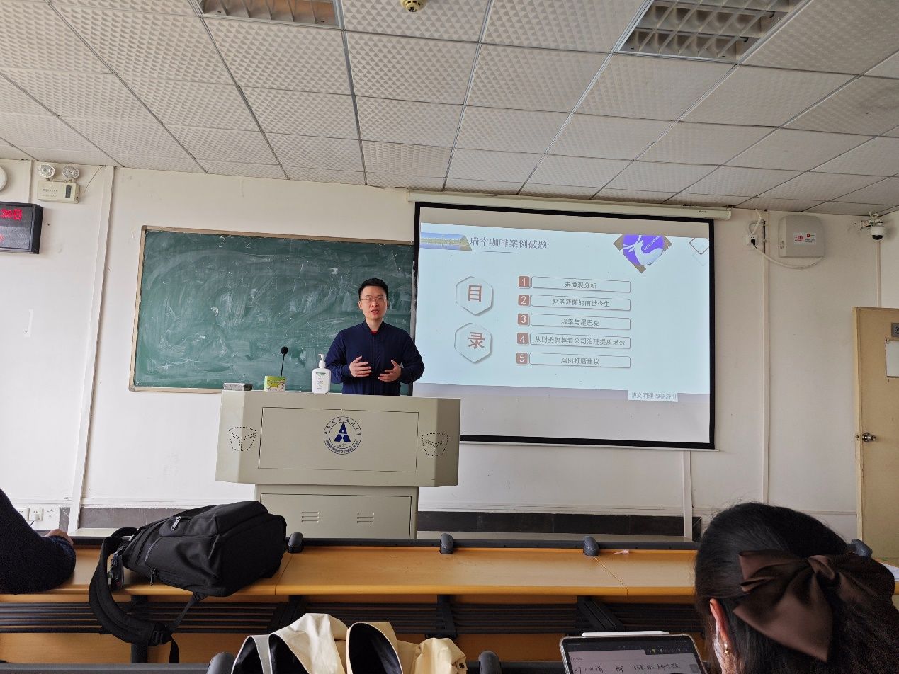 接着,专硕导师组组长王嘉鑫副教授就此次案例大赛第一阶段的案例资料“瑞幸咖啡:丑闻与转身”带领同学们进行解读,王嘉鑫副教授对瑞幸咖啡财务舞弊的前世今生、财务丑闻曝光后如何实现华丽转身、与竞争对手之间的优劣势以及财务舞弊角度对公司治理的影响进行剖析,并对如何优化案例报告提出相关建议。