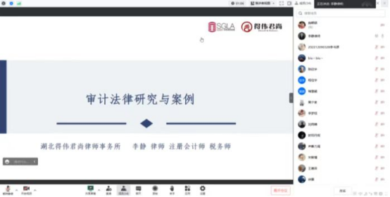 二十大报告将“坚持全面依法治国,推进法治中国建设”作为单独一部分加以强调,充分体现了党中央对全面依法治国的高度重视。为深入贯彻落实依法治国精神,推动我院(中心)拔尖创新型人才培养,我院(中心)诚邀李静律师(得伟君尚律师事务所合伙人、注册会计师、税务师、湖北省财税法学研究会理事、武汉律协财税专业委员会秘书长),于2023年4月1日、4月2日在文澴楼413教室以线上线下同步教学的方式,为审计专硕研究生讲授《审计法律研究与案例》课程。