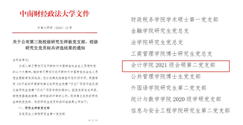 为深入学习贯彻习近平新时代中国特色社会主义思想和党的二十大精神,推动学习贯彻习近平新时代中国特色社会主义思想主题教育走深走实,充分发挥先进典型示范引领作用,7月3日,学校正式发文公布第三批校级研究生样板党支部评选结果,共10个研究生党总支、党支部入围,会计学院2021级会硕第二党支部荣膺在列。