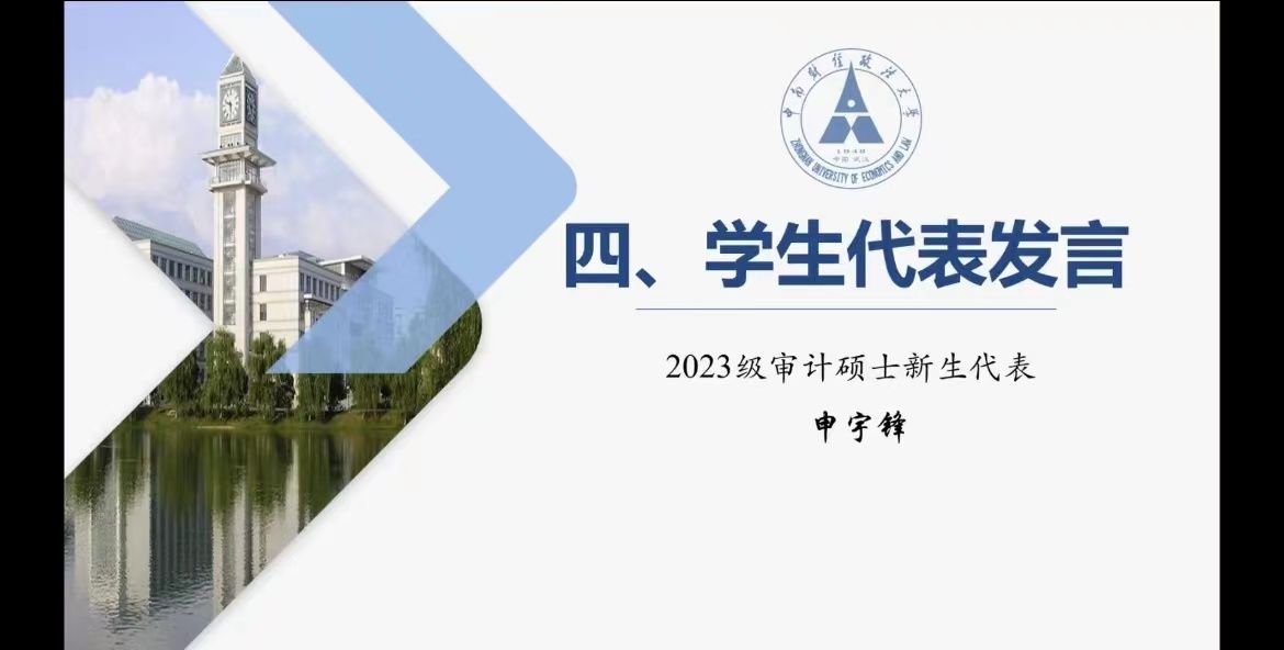 紧接着,申宇锋同学代表2023级审计硕士专业学位研究生发言,他以个人经历为例指出财会审工作需要持续学习、充电,表示在后疫情时代的经济复苏期内,审计专业在维护社会经济秩序、促进经济健康稳定发展发挥着至关重要的作用,全体同学们也定会不负众望、携手共进、共创辉煌!