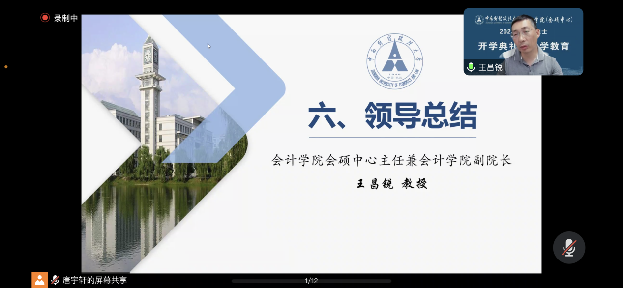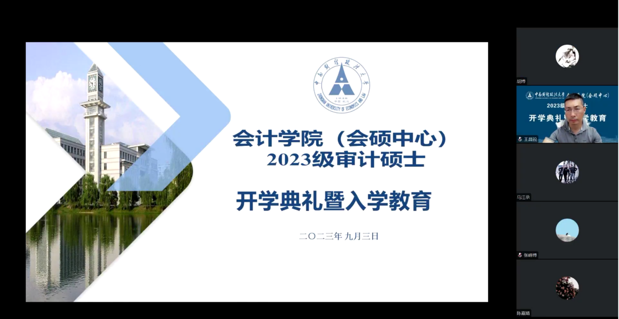2023年9月3日19:30分,会计学院(会硕中心)2023级审计硕士专业学位研究生新生开学典礼暨入学教育于腾讯会议平台举行。学院院长兼党委副书记张敦力教授,学院党委书记周勇同志,会硕中心主任兼副院长王昌锐教授,学院党委副书记、纪委书记兼行政副院长徐会超教授,学院副院长冉明东教授、李四海教授、陈丽红教授、学院党委副书记胡桂锬同志,专硕导师组组长宋丽梦副教授、季华副教授、王嘉鑫副教授,研究生教育工作办公室全体老师和2023级72位审计硕士专业学位研究生参加。会议由会硕中心主任兼副院长王昌锐教授主持。
