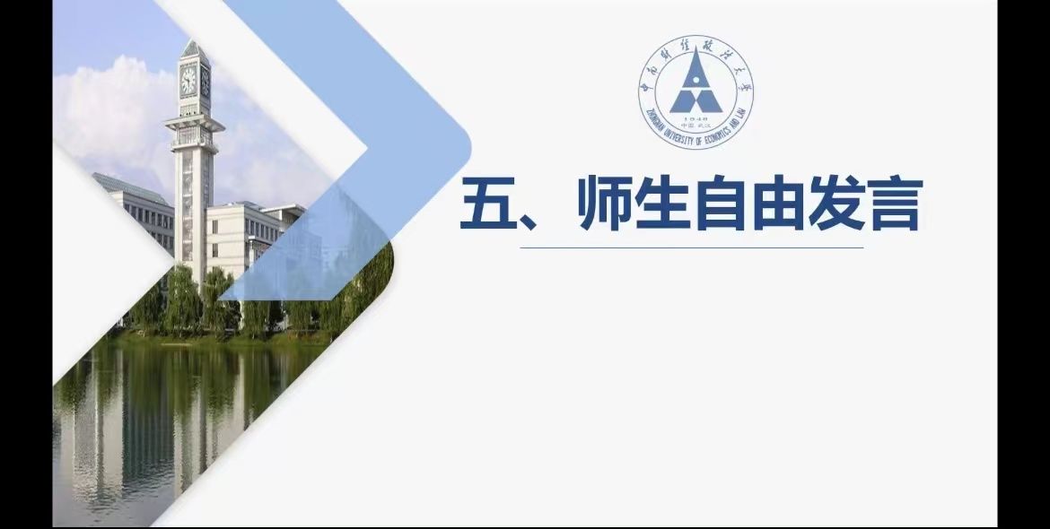 在师生自由发言环节,研究生教育工作办公室张昭妍老师、朱茜茜老师就有关事项进行了说明。最后,会硕中心主任兼副院长王昌锐教授做总结讲话。他希望同学们能够合理安排时间,加强专业知识的学习以提高专业素养,做到学业与事业共赢!